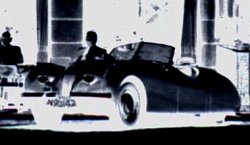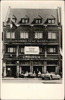 Het is druk op het terrasje van hotel Limburgia in Eindhoven. De eigenaar van de auto rechts [aanvulling: een Jaguar XK-120; zie reactie hieronder. Redactie] zal er ook wel een versnapering nuttigen. Maar wie is hij of zij? Het kenteken is niet helemaal goed leesbaar. Maar waarschijnlijk gaat het om N-70142 of N-73142. Wie herkent de auto?