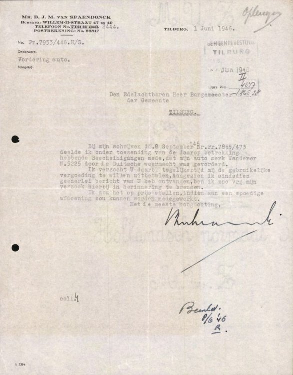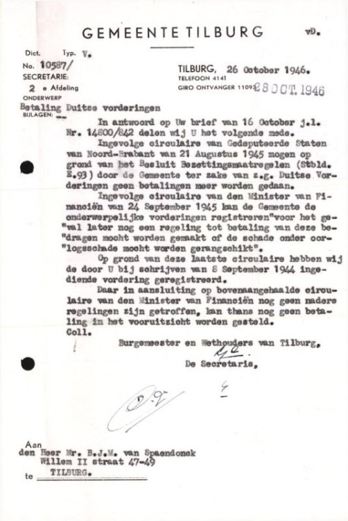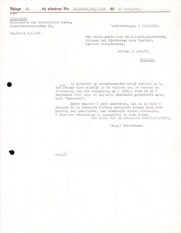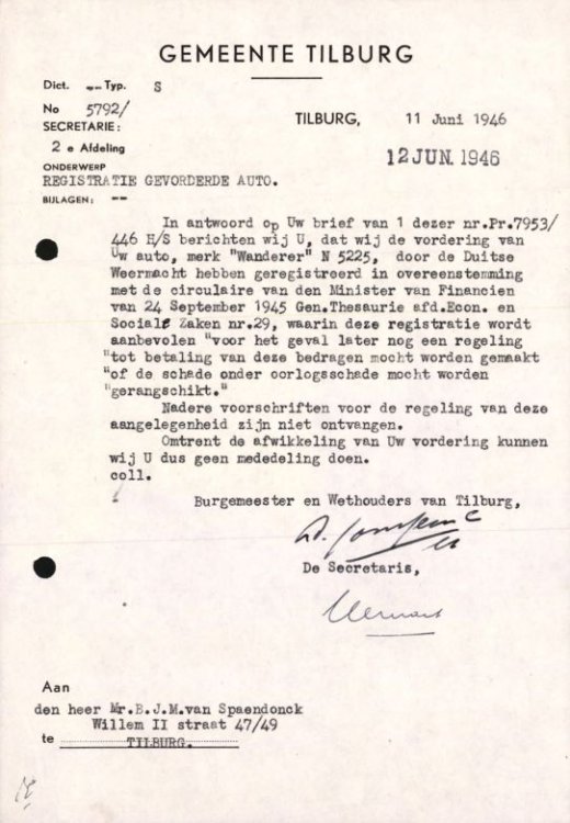 Op 16 oktober 1946 herhaalt Van Spaendonck nogmaals zijn verzoek, dit keer vergezeld van een kopie van een brief van het Ministerie van Economische Zaken van 1 oktober: In antwoord op nevensvermelde brief bericht ik U, dat het helaas niet mogelijk is te voldoen aan Uw verzoek om toekenning van een vergoeding ad f 3024.- voor Uw op 7 september 1944 door de Duische weermacht gevorderde asuto, merk "Wanderer". Eerst wanneer U kunt aantonen, dat in de door U terzake bij de Gemeente Tilburg geclaimde schade geen uitkeering zal geschieden, kan dezerzijds worden overwogen, U voor een vergoeding in aanmerking te doen komen. Maar het antwoord van de gemeente luidt hetzelfde: Er is geen regeling voor deze schadevergoedingen, dus kan de gemeente die ook niet uitkeren.