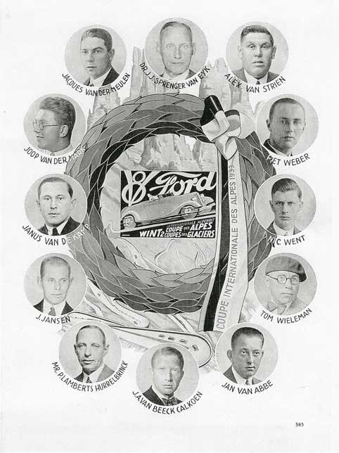 De Fordrijders deden het in het jaar 1933 erg goed en kregen overal lof. Mijn vader Jacques nam samen met Lex van Strien deel aan de 5e Internationale Alpenrit in een Ford V-8 met kenteken N-4705. De auto kreeg het startnummer 6. Ook Jan van Abbe deed mee, samen met J. v.d. Mark onder startnr. 5.