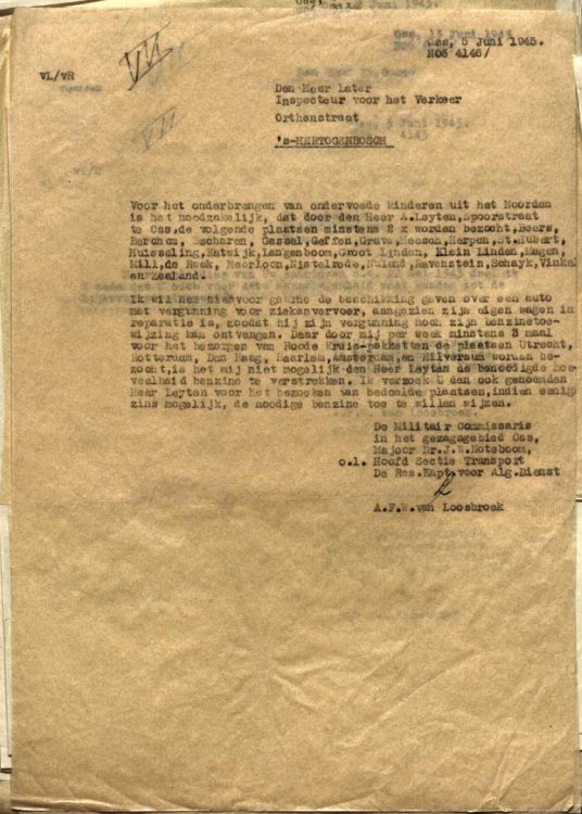 Zoals A. Leijten uit Oss. Hij is betrokken bij het onderbrengen van ondervoede kinderen uit nog maar kort geleden bevrijde noorden van Nederland en moet daarvoor minstens 2x naar Beers, Berghem, Escharen, Gassel, Geffen, Grave, Heesch, Herpen, Sint Hubert, Huisseling, Katwijk, Langenboom, Groot Linden, Klein L:inden, Megen, Mill, Reek, Neerloon, Nistelrode, Nuland, Ravenstein, Schaijk, Vinkel en Zeeland. Maar zijn eigen wagen is in reparatie, schrijft de transportofficier van de Districts Militaire Commissaris in Oss op 5 juni 1945 aan de Rijksverkeersinspecteur in Den Bosch en daarom heeft hij behoefte aan een auto met een rijvergunning en vergunning voor ziekenvervoer. En ook aan benzine.